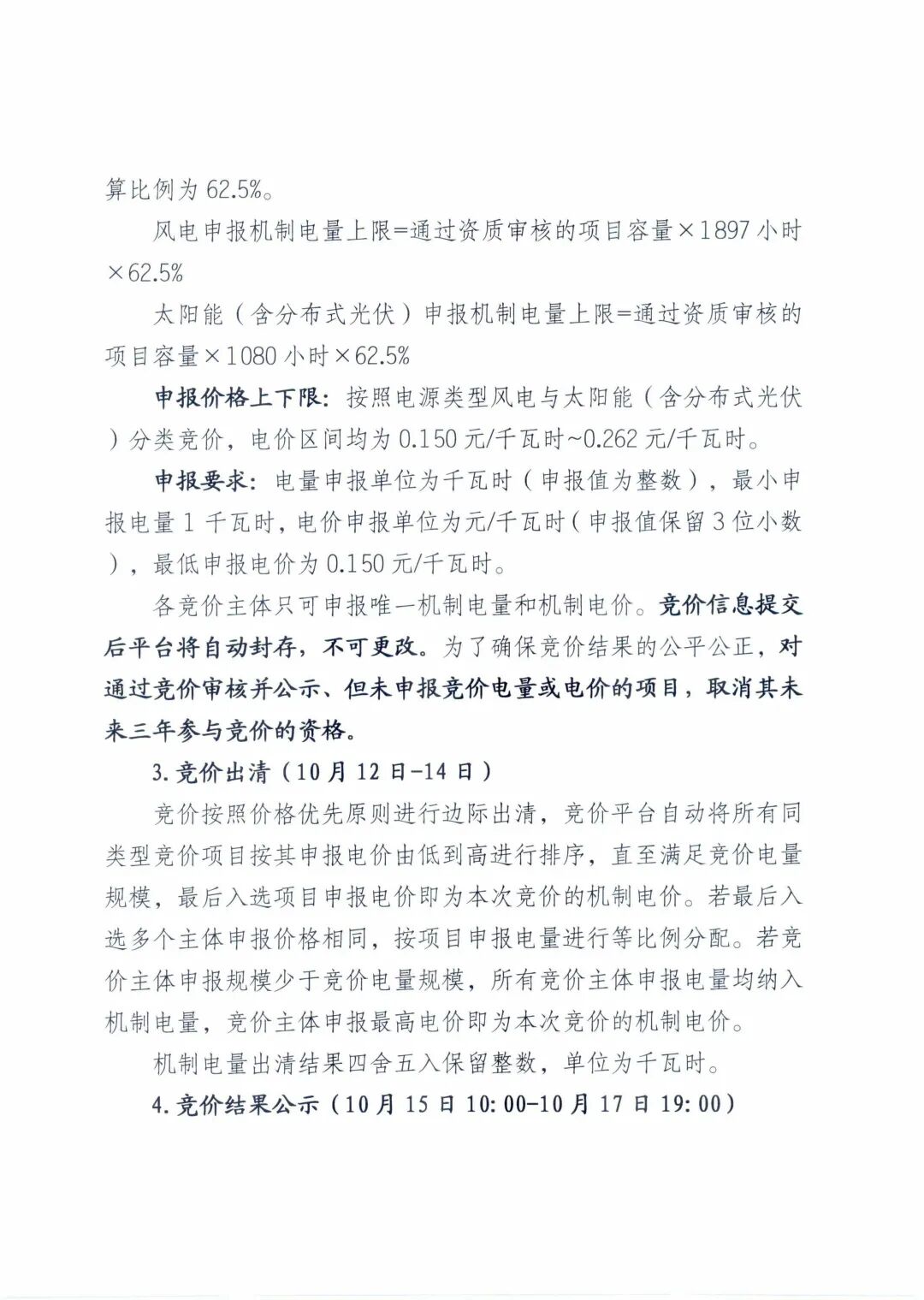 9月30日,國網新能源云平臺發布《新疆維吾爾自治區2025年度增量新能源項目機制電價競價公告》,新疆于10月10日10:00-10月11日19:00,參與競價的風電、集中式光伏項目通過新能源云平臺,分布式光伏和分布式新能源項目聚合商通過“網上國網”App申報電量、電價。 申報電量規模合計為2214761.8933萬千瓦時。 增量風電、太陽能項目競價機制電量總規模=通過競價資質審核的增量風電、太陽能項目裝機規模×風電、太陽能上年度利用小時數×《實施方案》明確的機制電量比例50%。 上年度(2024年9月-2025年8月)風電平均利用小時數1897小時,太陽能1080小時。 風電項目機制電量總規模為1853921.9755萬千瓦時、太陽能(含分布式光伏)機制電量總規模為360839.9178萬千瓦時。 風電、太陽能(含分布式光伏)單個項目機制電量申報上限計算比例為62.5%。 風電申報機制電量上限=通過資質審核的項目容量×1897小時×62.5% 太陽能(含分布式光伏)申報機制電量上限=通過資質審核的項目容量×1080小時×62.5% 申報價格上下限:按照電源類型風電與太陽能(含分布式光伏)分類競價,電價區間均為0.15元/千瓦時~0.262元/千瓦時。 申報要求:電量申報單位為千瓦時(申報值為整數),最小申報電量1千瓦時,電價申報單位為元/千瓦時(申報值保留3位小數),最低申報電價為0.15元/千瓦時。 各競價主體只可申報唯一機制電量和機制電價。競價信息提交后平臺將自動封存,不可更改。為了確保競價結果的公平公正,對通過競價審核并公示、但未申報競價電量或電價的項目,取消其未來三年參與競價的資格。 原文如下: