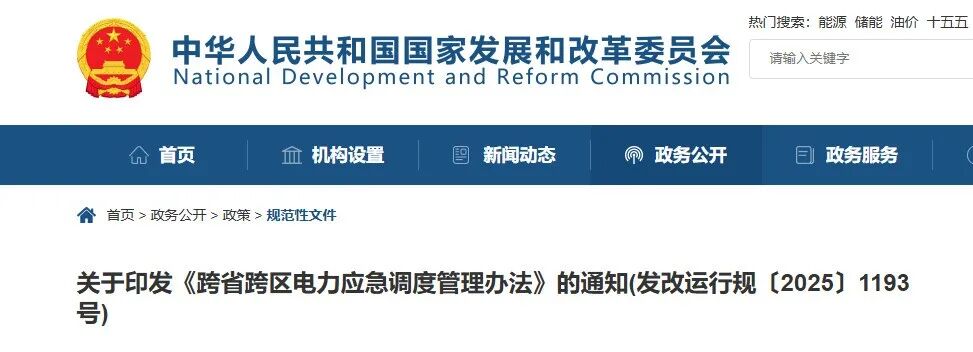 國(guo)家發(fa)展(zhan)改(gai)革委 國(guo)家能(neng)源局(ju)關于(yu)印(yin)發(fa)《跨省跨區電(dian)力(li)應急調度管理辦法》的(de)通知 各(ge)省(sheng)、自(zi)治區、直轄市(shi)發展改革委(wei)(wei)、能源(yuan)(yuan)局,北(bei)京市(shi)城管(guan)委(wei)(wei),天津市(shi)、遼寧省(sheng)、上海市(shi)、重(zhong)慶市(shi)、甘(gan)肅省(sheng)工(gong)信廳(經信委(wei)(wei)),中(zhong)(zhong)(zhong)國(guo)(guo)核(he)工(gong)業集(ji)團有(you)(you)(you)(you)限(xian)(xian)公(gong)司(si)、國(guo)(guo)家(jia)電(dian)網有(you)(you)(you)(you)限(xian)(xian)公(gong)司(si)、中(zhong)(zhong)(zhong)國(guo)(guo)南方電(dian)網有(you)(you)(you)(you)限(xian)(xian)責(ze)任(ren)公(gong)司(si)、中(zhong)(zhong)(zhong)國(guo)(guo)華能集(ji)團有(you)(you)(you)(you)限(xian)(xian)公(gong)司(si)、中(zhong)(zhong)(zhong)國(guo)(guo)大唐(tang)集(ji)團有(you)(you)(you)(you)限(xian)(xian)公(gong)司(si)、中(zhong)(zhong)(zhong)國(guo)(guo)華電(dian)集(ji)團有(you)(you)(you)(you)限(xian)(xian)公(gong)司(si)、國(guo)(guo)家(jia)電(dian)力(li)(li)投資集(ji)團有(you)(you)(you)(you)限(xian)(xian)公(gong)司(si)、中(zhong)(zhong)(zhong)國(guo)(guo)長(chang)江(jiang)三峽(xia)集(ji)團有(you)(you)(you)(you)限(xian)(xian)公(gong)司(si)、國(guo)(guo)家(jia)能源(yuan)(yuan)投資集(ji)團有(you)(you)(you)(you)限(xian)(xian)責(ze)任(ren)公(gong)司(si)、中(zhong)(zhong)(zhong)國(guo)(guo)廣(guang)核(he)集(ji)團有(you)(you)(you)(you)限(xian)(xian)公(gong)司(si)、國(guo)(guo)投電(dian)力(li)(li)控股(gu)股(gu)份有(you)(you)(you)(you)限(xian)(xian)公(gong)司(si)、華潤(run)電(dian)力(li)(li)控股(gu)有(you)(you)(you)(you)限(xian)(xian)公(gong)司(si),北(bei)京電(dian)力(li)(li)交易中(zhong)(zhong)(zhong)心、廣(guang)州電(dian)力(li)(li)交易中(zhong)(zhong)(zhong)心: 為(wei)深入貫徹落實(shi)黨的二(er)十大(da)和(he)(he)二(er)十屆三中(zhong)(zhong)全(quan)會精神,更好統籌發展和(he)(he)安全(quan),加快規(gui)劃建設新型能源體系,協(xie)同推進省間電力互(hu)濟,保障(zhang)電力安全(quan)穩(wen)定供應,根(gen)據《中(zhong)(zhong)華(hua)人民共和(he)(he)國(guo)能源法》《中(zhong)(zhong)華(hua)人民共和(he)(he)國(guo)電力法》《電網調(diao)(diao)度管(guan)(guan)理條例》等法律(lv)法規(gui),我(wo)們制定了(le)《跨省跨區電力應急(ji)調(diao)(diao)度管(guan)(guan)理辦法》。現印(yin)發給你(ni)們,請遵照執行。 國(guo)家發展(zhan)改革委 國 家 能 源(yuan) 局(ju) 2025年9月9日(ri)