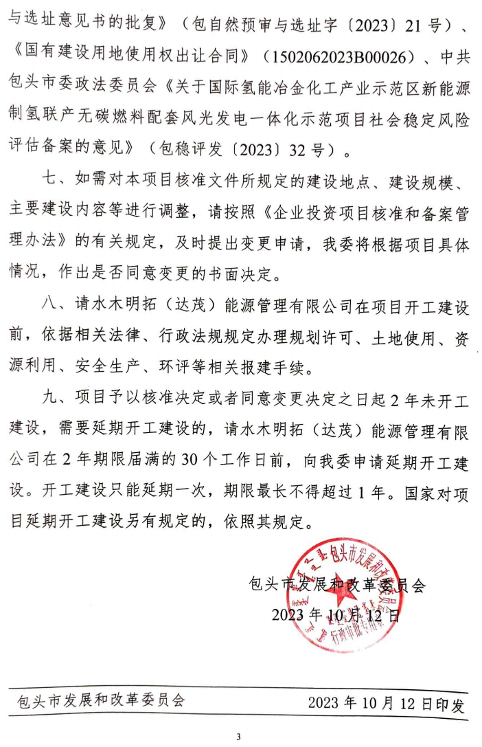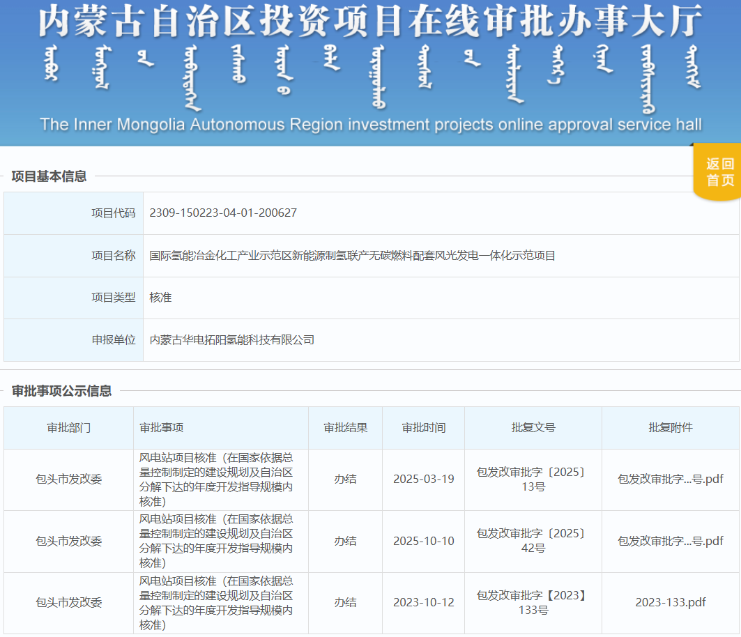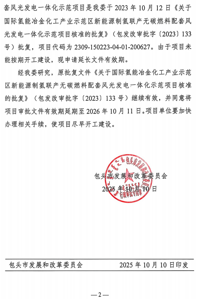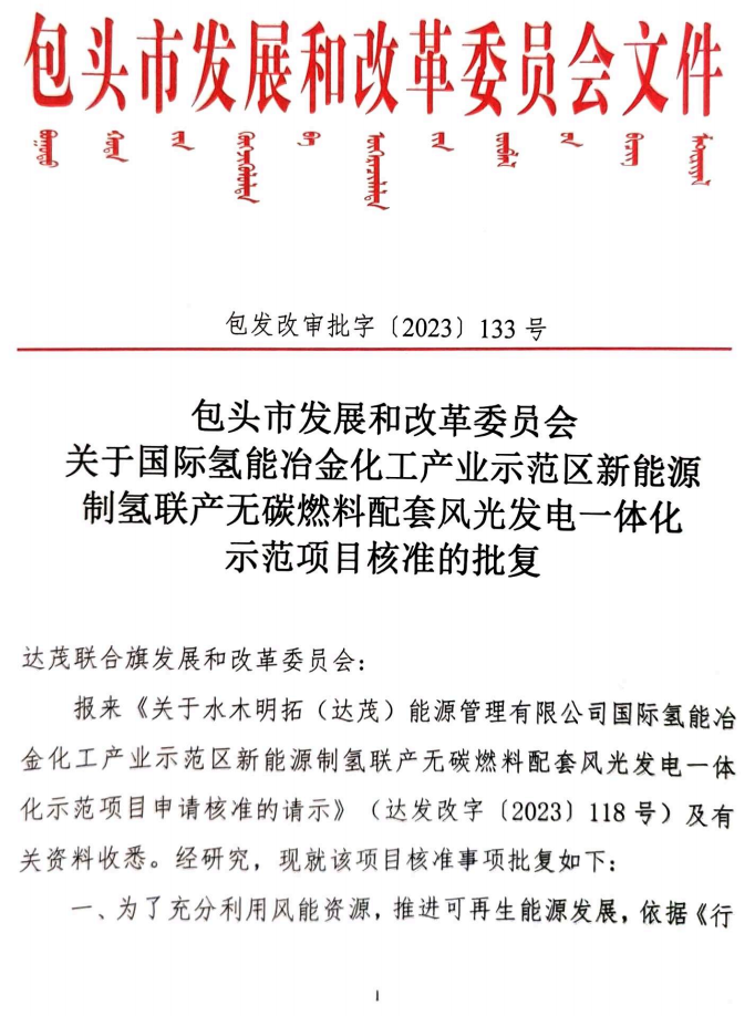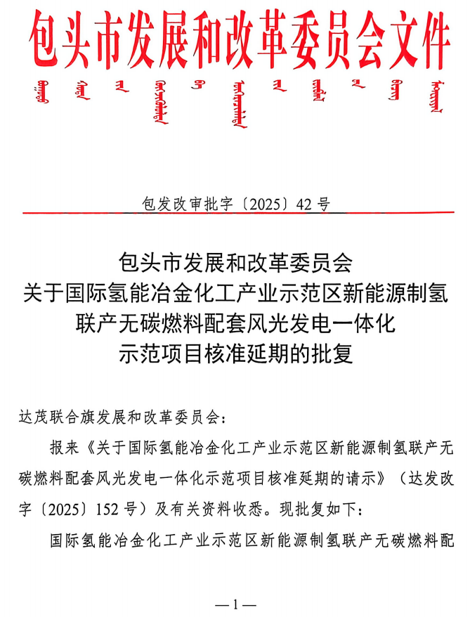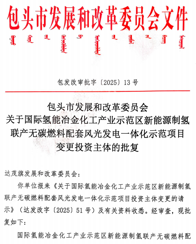 近日,包頭市發展和改革委員會關于國際氫能冶金化工產業示范區新能源制氫聯產無碳燃料配套風光發電一體化示范項目核準延期的批復。 文件稱,由于項目未能按期開工建設,現申請延長文件有效期。將項目審批文件有效期延期至2026年10月11日。要求項目單位要加快辦理相關手續,使項目盡早開工建設。 據了解,2023年10月12日,國際氫能冶金化工產業示范區新能源制氫聯產無碳燃料配套風光發電一體化示范項目獲核準,項目建設地點為達茂旗巴音花鎮白音敖包嘎查、白音查干嘎查、明安鎮希拉朝魯嘎查,白云礦區白云鄂博巴潤工業園區。 該項目建設規模為:新建風電裝機規模500MW,安裝75臺單機容量為6700kw風力發電機組及配套設施,新建220kV升壓站一座;建設電化學儲能75MW/150MWh、儲氫30000Nm3(2h)、 脫鹽水、循環水系統、辦公生活區等相關配套設施;年產氫量2.8萬噸,制氫裝機容量為5.88萬Nm3/h。總投資為35.89億元。 2025年3月19日,由于項目單位內部分工調整和建設實際需要,項目單位提出變更投資主體,項目單位由水木明拓(達茂)能源管理有限公司變更為內蒙古華電拓陽氫能科技有限公司。 公告如下: